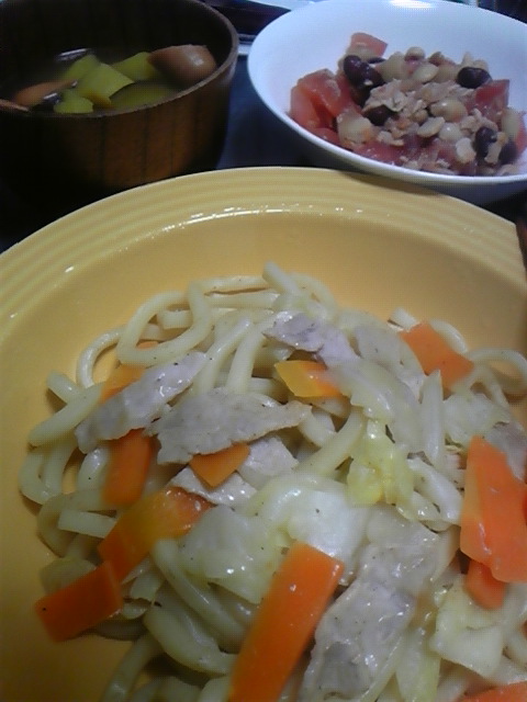蒸しうどんと、お豆のサラダと、さつまいもとウィンナーのスープ。